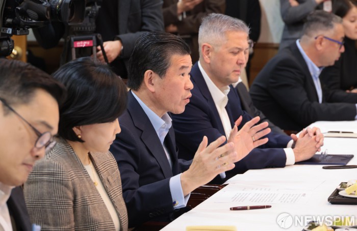 [서울=뉴스핌] 이길동 기자 = 제임스 김 주한미상공회의소 회장이 9일 서울 종로구 정부서울청사에서 김정관 산업통상부 장관 초청 정책 간담회에서 발언하고 있다. 2026.01.09gdlee@newspim.com