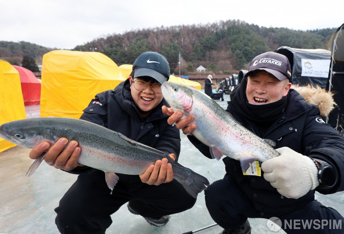 [서울=뉴스핌] 9일 강원도 평창군 진부면 오대천 일원에 개막한 대한민국 대표 겨울축제 '평창송어축제'를 찾은 방문객들이 송어 얼음낚시를 즐기고 있다. 개막 20주년을 맞는 올해 축제는 ‘겨울이 더 즐거운 송어 나라, 평창’이라는 주제 아래 메인프로그램인 송어낚시를 넘어 전시·문화·휴식 콘텐츠를 강화한 겨울 종합 관광축제로 내달 9일 까지 방문객을 맞는다. [사진=평창군청] 2026.01.09 photo@newspim.com