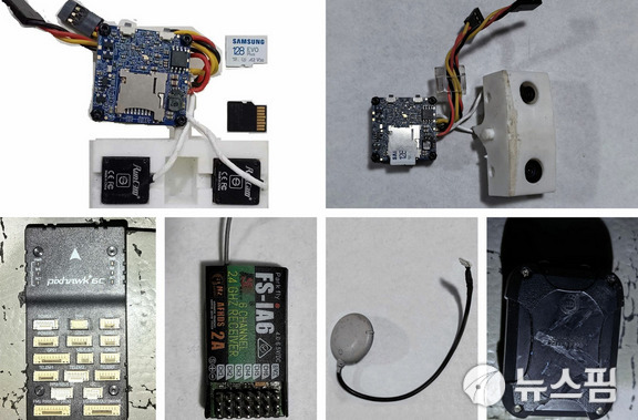 북한이 내놓은 사진에는 부서진 무인기 동체와 대부분 중국산인 부품, 삼성 메모리카드 등이 드러난다.
