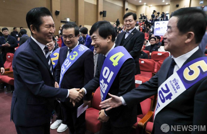 [서울=뉴스핌] 윤창빈 기자 = 정청래 더불어민주당 대표가 11일 서울 여의도 국회 의원회관에서 열린 최고위원 보궐선거 후보자 합동연설회에서 이성윤, 강득구, 문정복, 이건태 후보와 인사를 나누고 있다. 2026.01.11 pangbin@newspim.com