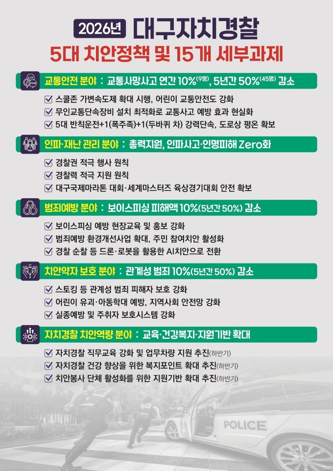 [대구=뉴스핌] 김용락 기자=대구자치경찰위원회(위원장 이중구)는 2026년을 '시민과 함께 만드는 일상안전의 해'로 정하고, 교통안전·인파·범죄예방·치안약자 보호·치안역량 강화 등 5대 정책 분야 및 15개 세부 과제를 추진해 나갈 계획이다.