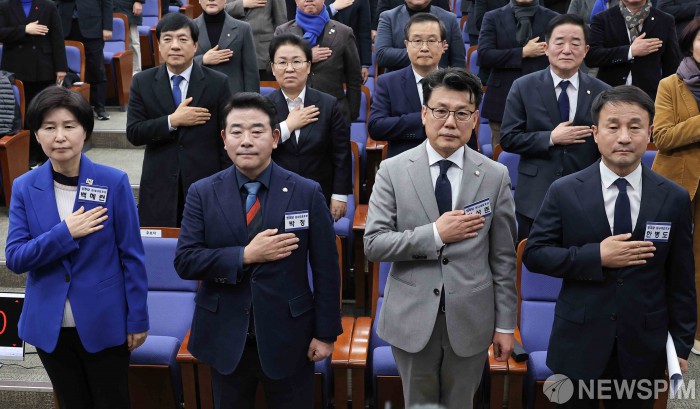 [서울=뉴스핌] 윤창빈 기자 = 백혜련, 박정, 진성준, 한병도 더불어민주당 원내대표 후보, 이성윤, 문정복, 이건태, 강득구 최고위원 후보가 11일 서울 여의도 국회에서 열린 제22대 국회 더불어민주당 제2기 원내대표 선출 의원총회에서 국민의례를 하고 있다. 2026.01.11 pangbin@newspim.com