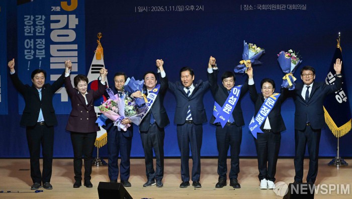 [서울=뉴스핌] 윤창빈 기자 = 더불어민주당 최고위원에 선출된 강득구, 이성윤, 문정복 의원이 11일 서울 여의도 국회 의원회관에서 열린 최고위원 보궐선거 후보자 합동연설회에서 정청래 당대표와 함께 당선 세레모니를 하고 있다. 2026.01.11 pangbin@newspim.com