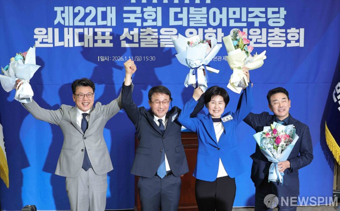 [서울=뉴스핌] 윤창빈 기자 = 더불어민주당 신임 원내대표에 선출된 한병도 의원이 11일 서울 여의도 국회에서 열린 제22대 국회 더불어민주당 제2기 원내대표 선출 의원총회에서 후보들과 꽃다발을 들고 기념촬영을 하고 있다. 왼쪽부터 진성준 후보, 한병도 신임 원내대표, 백혜련 후보, 박정 후보.. 2026.01.11 pangbin@newspim.com
