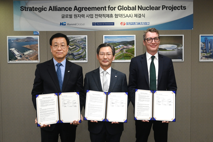 김용식 한미글로벌 사장(왼쪽)과 김태균 한국전력기술 사장(가운데), 토머스 에인도우 터너앤타운젠드 상무가 지난 8일 '전략적 제휴 협약(SAA)'을 체결하고 기념사진을 찍고 있다. [사진=한전기술] 2026.01.12 aaa22@newspim.com