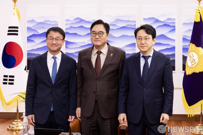 [서울=뉴스핌] 정일구 기자 = 우원식 국회의장(가운데)이 12일 오전 서울 여의도 국회 의장실에서 한병도 더불어민주당 신임 원내대표(왼쪽), 천준호(오른쪽) 원내운영수석부대표와 기념촬영을 하고 있다. 2026.01.12 mironj19@newspim.com