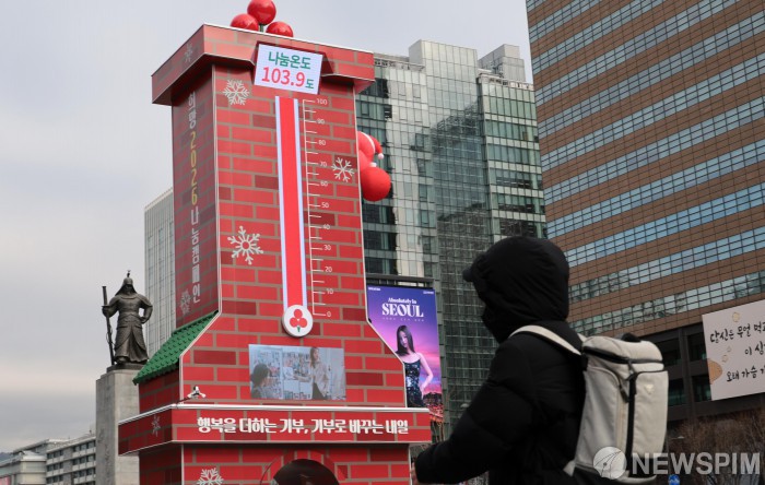 [서울=뉴스핌] 이길동 기자 = 12일 서울 종로구 광화문 광장에 설치된 사랑의 온도탑 나눔온도가 103.9도를 가리키고 있다. 사랑의열매 사회복지공동모금회는 이날 '희망 2026 나눔 캠페인'의 사랑의 온도탑 나눔 온도가 100도를 돌파했다고 밝혔다. 11일 자정까지 사랑의 열매를 통해 모두 4,676억 원이 모금돼 목표액인 4,500억 원의 103.9%를 기록했다. 2026.01.12 gdlee@newspim.com
