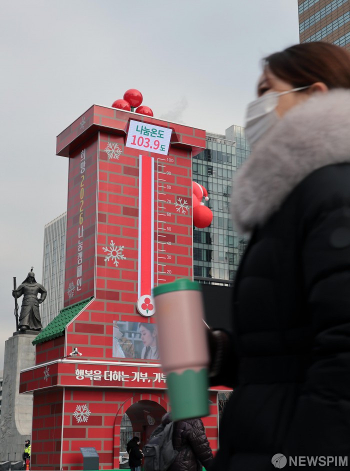 [서울=뉴스핌] 이길동 기자 = 12일 서울 종로구 광화문 광장에 설치된 사랑의 온도탑 나눔온도가 103.9도를 가리키고 있다. 사랑의열매 사회복지공동모금회는 이날 '희망 2026 나눔 캠페인'의 사랑의 온도탑 나눔 온도가 100도를 돌파했다고 밝혔다. 11일 자정까지 사랑의 열매를 통해 모두 4,676억 원이 모금돼 목표액인 4,500억 원의 103.9%를 기록했다. 2026.01.12 gdlee@newspim.com