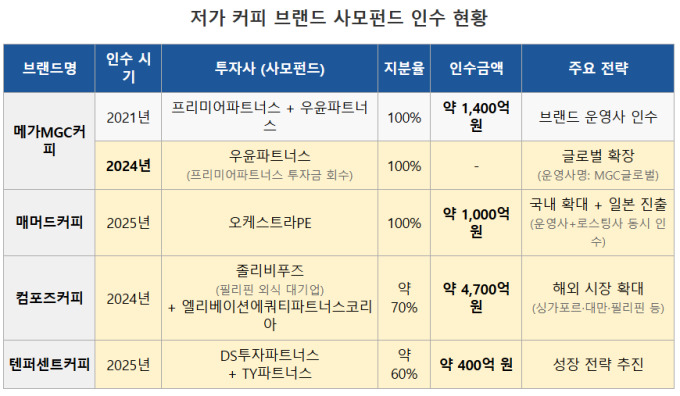 사모펀드의 저가 커피 투자 흐름은 이번이 처음이 아니다. 메가MGC커피는 2021년부터 사모펀드인 프리미어파트너스와 우윤파트너스의 투자를 받은 뒤 현재는 우윤파트너스가 지분 100%를 보유하고 있다. 메가MGC커피는 최근 사명을 'MGC글로벌'로 변경하며 글로벌 확장에 전면에 내세우기도 했다.
