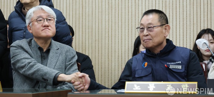 [서울=뉴스핌] 이형석 기자 = 김정환 서울시버스운송사업조합 이사장(왼쪽)과 박점곤 서울시버스노동조합 위원장이 12일 오후 서울 영등포구 서울지방노동위원회에서 열린 특별조정위원회 사후 조정회의에서 악수를 하고 있다. 2026.01.12 leehs@newspim.com