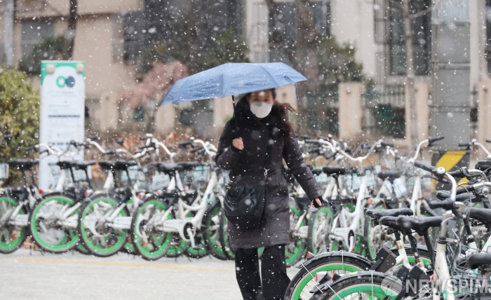 [서울=뉴스핌] 이형석 기자 = 12일 오후 서울 여의도 인근에서 한 시민이 내리는 눈을 맞으며 발걸음을 재촉하고 있다. 2026.01.12 leehs@newspim.com