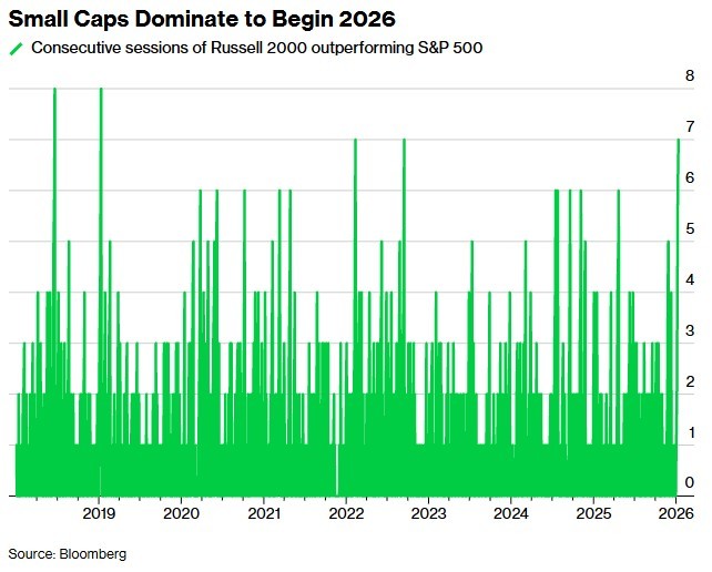 월요일 사상 최고치로 마감한 소형주 러셀2000지수는 S&P500지수 대비 7거래일 연속 상승세를 이어갔다. 러셀2000지수가 이보다 긴 연속 상승을 기록한 것은 2019년 1월이 마지막이었는데, 당시 주식시장은 약세장 직전까지 몰렸던 급락에서 반등하고 있었다.