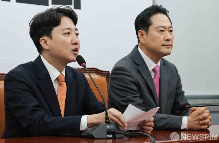 [서울=뉴스핌] 윤창빈 기자 = 이준석 개혁신당 대표가 13일 서울 여의도 국회에서 장동혁 국민의힘 대표와 회동을 하며 발언하고 있다. 2026.01.13 pangbin@newspim.com