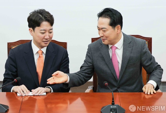 [서울=뉴스핌] 윤창빈 기자 = 장동혁 국민의힘 대표가 13일 서울 여의도 국회에서 이준석 개혁신당 대표와 회동을 하며 이 대표에게 먼저 발언을 제안하고 있다. 2026.01.13 pangbin@newspim.com