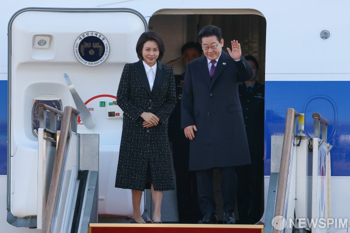 [성남=뉴스핌] 류기찬 기자 = 다카이치 사나에 일본 총리와의 한일 정상회담을 위해 방일하는 이재명 대통령과 김혜경 여사가 13일 오전 경기 성남시 서울공항에서 공군 1호기에 올라 인사를 하고 있다. 2026.01.13 ryuchan0925@newspim.com