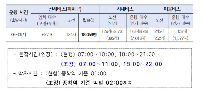 지하철의 경우 출퇴근 시간대 혼잡 완화 및 불편 사항을 해소하기 위해 1시간 연장 및 막차 연장 등을 통해서 일 172회 증회 운행을 추진하는 등 파업 사전 단계부터 준비하는 등 수송력 확대에 집중하고 있다. 뿐만 아니라 오늘 13일 퇴근길부터 출퇴근 집중 운행 시간을 1시간 연장하여 파업 종료 시까지 추가 증회도 추진한다.