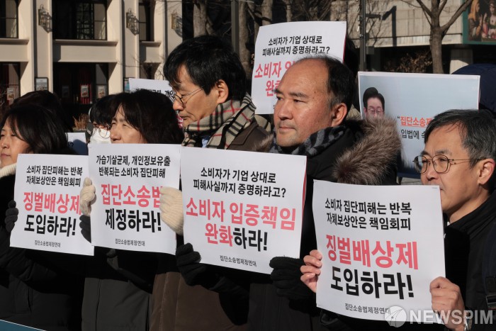 [서울=뉴스핌] 이길동 기자 = 한국소비자단체협의회등 시민사회단체 관계자들이 13일 서울 종로구 광화문광장 이순신 동상앞에서 '소비자 보호를 위한 집단소송법 제정연대 출범 기자회견'을 하고 있다. 2026.01.13 gdlee@newspim.com