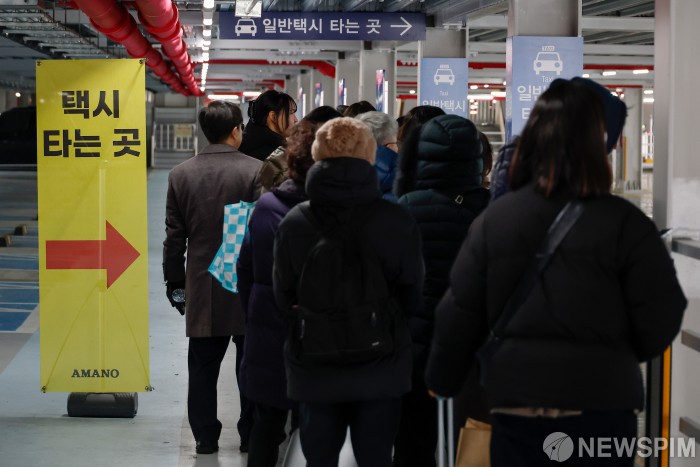 [성남=뉴스핌] 류기찬 기자 = 서울 시내버스가 총파업에 돌입한 13일 오전 서울 강남구 수서역에서 시민들이 택시를 탑승하기 위해 대기하고 있다. 서울 시내버스가 파업으로 멈춰 선 것은 2024년 이후 약 2년 만이다. 2026.01.13 ryuchan0925@newspim.com