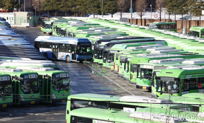 [서울=뉴스핌] 양윤모 기자 = 13일 서울시버스 노사의 임금협상 결렬로 노조가 총파업에 돌입한 가운데, 서울 양천구 공영차고지에 시내버스가 운행을 멈추고 주차되어 있다. 서울시내버스는 64개사 394개 노선에서 7천382대가 운행 중이다. 2026.01.13 yym58@newspim