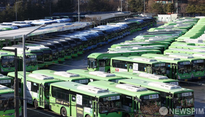 [서울=뉴스핌] 양윤모 기자 = 13일 서울시버스 노사의 임금협상 결렬로 노조가 총파업에 돌입한 가운데, 서울 양천구 공영차고지에 시내버스가 운행을 멈추고 주차되어 있다. 서울시내버스는 64개사 394개 노선에서 7천382대가 운행 중이다. 2026.01.13 yym58@newspim