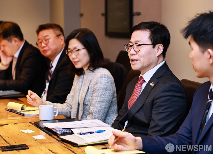[서울=뉴스핌]여한구 산업통상부 통상교섭본부장이 12일(현지시간) 미국 워싱턴 DC에서 크리스틴 블리스(Christine Bliss) 미국 서비스산업연합(CSI) 회장을 비롯한 CSI 관계자 및 회원사 등이 참석한 가운데 열린 미국 CSI 라운드테이블에 참석, 발언하고 있다. [사진=산업통상부] 2026.01.13 photo@newspim.com