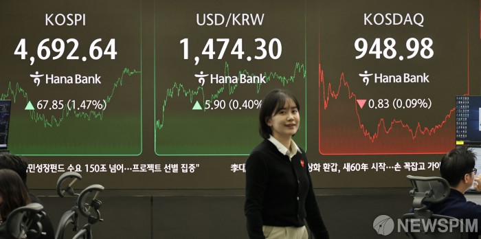 [서울=뉴스핌] 양윤모 기자 = 13일 오후 코스피가 전장 종가보다 67.85 포인트(1.47%) 상승하며 4692.64로, 코스닥은 0.83 포인트(0.09%) 하락한 948.98로 장을 마감한 가운데, 서울 중구 하나은행 딜링룸에서 직원들이 업무를 보고 있다. 서울외환시장에서 달러/원 환율은 전장 대비 5.90원 상승한 1474.30원에 주간거래를 마감했다. 2026.01.13 yym58@newspim.com