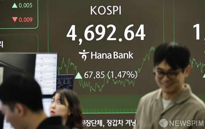 [서울=뉴스핌] 양윤모 기자 = 13일 오후 코스피가 전장 종가보다 67.85 포인트(1.47%) 상승하며 4692.64로, 코스닥은 0.83 포인트(0.09%) 하락한 948.98로 장을 마감한 가운데, 서울 중구 하나은행 딜링룸에서 직원들이 업무를 보고 있다. 서울외환시장에서 달러/원 환율은 전장 대비 5.80원 상승한 1474.30원에 주간거래를 마감했다. 2026.01.13 yym58@newspim.com
