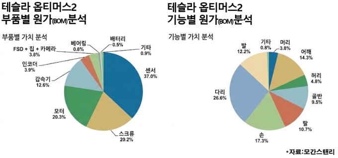 테슬라 옵티머스2를 부품별로 뜯어보면 더 선명해진다. 모간스탠리에 따르면 옵티머스2의 BOM은 센서가 37%(2만달러), 스크류 20.2%(1만1000달러), 모터 20.3%(1만1000달러), 감속기 12.6%(7000달러)인 반면, 머리(FSD 칩·카메라 등)는 3.8%다. 옵티머스2의 BOM을 대당 5만~6만달러(소프트웨어 제외)로 추정한 값이다.