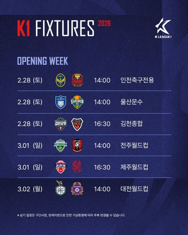 한편 연맹은 이번에 발표된 2026시즌 K리그1 정규라운드 일정이 2025-2026 아시아축구연맹(AFC) 챔피언스리그 엘리트(ACLE) 및 ACL2에 참가하는 구단들의 일정에 따라 일부 조정되거나 순연될 가능성이 있다고 덧붙였다.