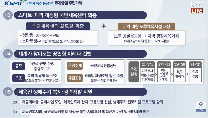 이에대해 최휘영 장관은 "공연형 아레나는 조금 더 고민이 필요해서 긴밀하게 서로 계속 이야기를 나눴으면 좋겠다"라고 밝혔다. 이는 스포츠와 공연을 동시에 고려한 설계의 복합 공연장이다. 이를 위해 체육진흥공단은 주체가 돼 공공 재원과 함께 민간 투자도 받는 방안을 강구중이다.