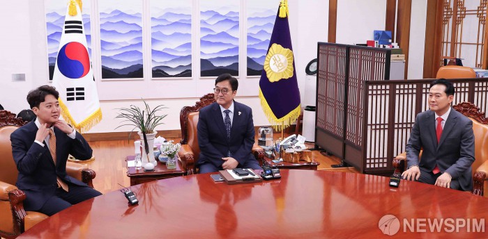 [서울=뉴스핌] 윤창빈 기자 = 우원식 국회의장, 장동혁 국민의힘 대표, 이준석 개혁신당 대표가 13일 서울 여의도 국회에서 공천비리·통일교특검 등을 논의하기 위해 회동하고 있다. 2026.01.13 pangbin@newspim.com