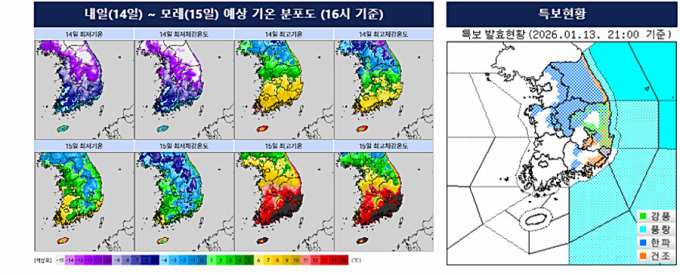 14~15일 예상기온 분포도(왼쪽)와 특보 현황[그래픽=기상청]2026.01.13 nulcheon@newspim.com