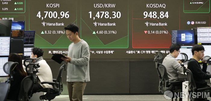 [서울=뉴스핌] 양윤모 기자 = 14일 오전 코스피가 전장 종가보다 8.32포인트(0.18%) 상승하며 4700.96으로, 코스닥은 0.14 포인트(0.01%) 하락한 948.84로 장을 시작한 가운데, 서울 중구 하나은행 딜링룸에서 직원들이 업무를 보고 있다. 서울외환시장에서 달러/원 환율은 전장 대비 4.60원 상승한 1478.30원에 주간거래를 시작했다. 2026.01.14 yym58@newspim.com