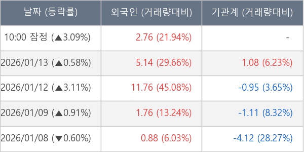 [서울=뉴스핌] 로보뉴스 = 14일 10시 15분 현재 한전KPS(051600)는 전일 대비 3.09% (현재가 53,300원) 상승했고, 외국인이 최근 5일 연속 순매수(누적 22.30만 주, 잠정) 행진을 하고 있다.