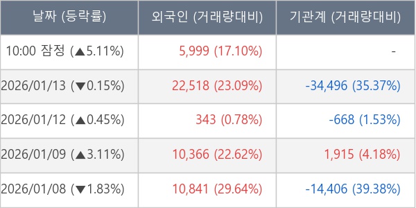 [서울=뉴스핌] 로보뉴스 = 14일 10시 15분 현재 한텍(098070)은 전일 대비 5.11% (현재가 34,950원) 상승했고, 외국인이 최근 12일 연속 순매수(누적 10.88만 주, 잠정) 행진을 하고 있다.