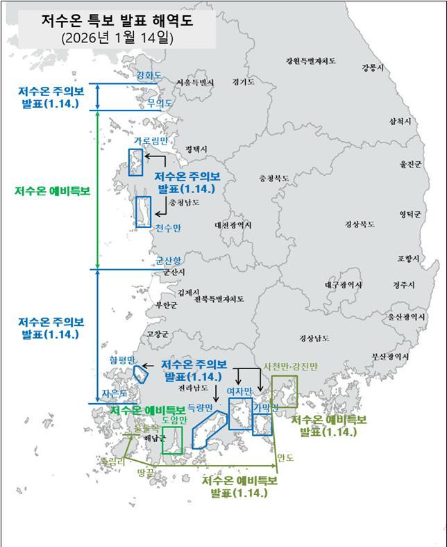 저수온 예비특보는 어업인의 사전 대응을 돕기 위해 수온 7℃ 이하가 예측되는 해역에 발령되며, 이후 수온이 낮아질 경우 ▲4℃ 도달 시 '저수온 주의보', ▲4℃ 이하 상태가 3일 이상 지속될 시 '저수온 경보'로 단계가 격상된다.