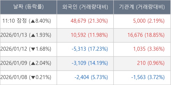 [서울=뉴스핌] 로보뉴스 = 14일 11시 30분 현재 한국가구(004590)는 외국인과 기관이 각각 4.87 만 주, 0.50 만 주 순매수(잠정) 하면서 전일 대비 8.40% (현재가 5,160원) 상승하고 있다.
