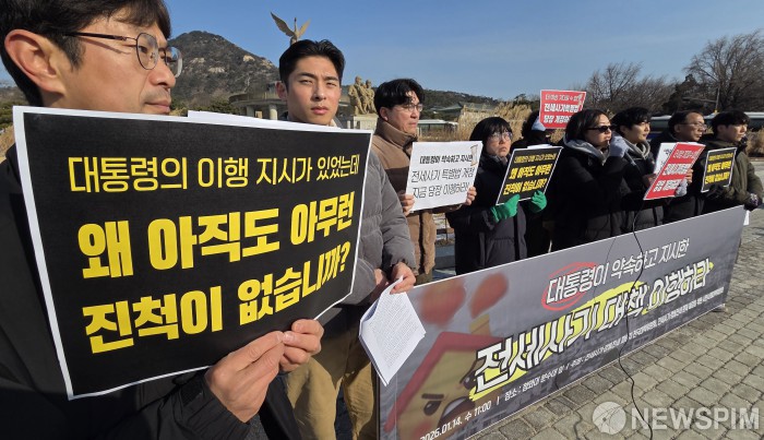 [서울=뉴스핌] 양윤모 기자 = 전세사기·깡통전세 피해자 전국대책위원회가 14일 오전 청와대 분수대앞에서 이재명 대통령이 약속하고 지시한 전세사기 대책 이행을 촉구하는 기자회견을 개최했다. 2026.01.14 yym58@newspim.com