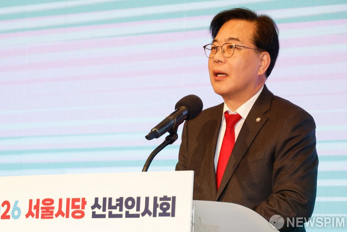 [서울=뉴스핌] 류기찬 기자 = 송언석 국민의힘 원내대표가 14일 오전 서울 여의도 중소기업중앙회 KBIZ홀에서 열린 2026 국민의힘 서울시당 신년인사회에서 신년사를 하고 있다. 2026.01.14 ryuchan0925@newspim.com