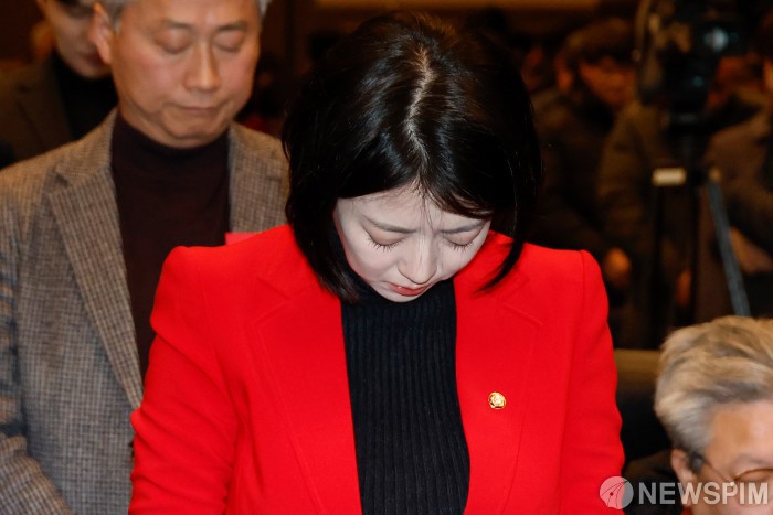 [서울=뉴스핌] 류기찬 기자 = 배현진 국민의힘 서울특별시당 위원장이 14일 오전 서울 여의도 중소기업중앙회 KBIZ홀에서 열린 2026 국민의힘 서울시당 신년인사회에서 묵념을 하고 있다. 2026.01.14 ryuchan0925@newspim.com