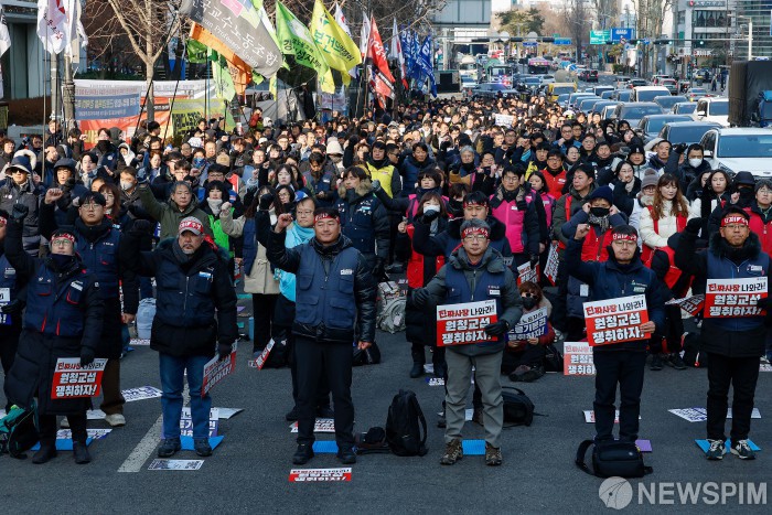 [서울=뉴스핌] 류기찬 기자 = 민주노총 조합원들이 14일 오후 서울 중구 서울지방고용노동청 앞에서 열린 2026 민주노총 신년 결의대회에서 노동 의례를 제창하고 있다. 2026.01.14 ryuchan0925@newspim.com