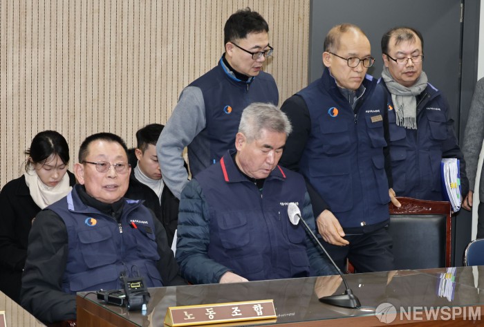 [서울=뉴스핌] 양윤모 기자 = 서울시버스 노사의 임금협상 결렬로 총파업 돌입 이틀째인 14일 오후 서울시내버스 노조와 사측이 서울 영등포구 서울지방노동위원회 주관으로 제2차 사후조정회의를 개최했다. 김정환 서울시버스운송조합 이사장과 박점곤 서울시버스노동조합 위원장이 참석한 가운데, 핵심 쟁점은 통상임금 범위, 임금체계 개편, 임금 인상률(노조는 3%·사측은 10.3% 인상안 제시) 이다. 2026.01.14 yym58@newspim.com