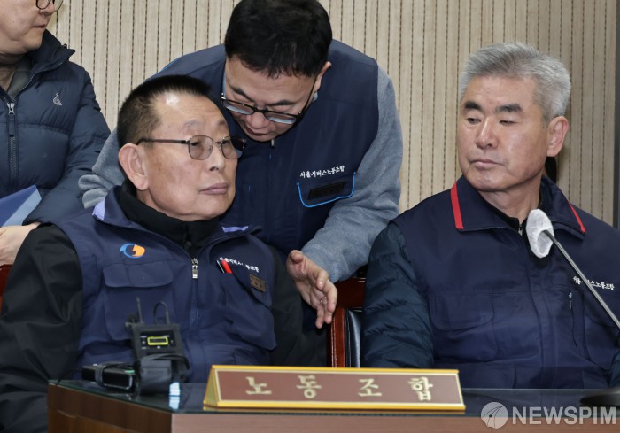 [서울=뉴스핌] 양윤모 기자 = 박점곤 서울시버스노동조합 위원장이 서울시버스 노사의 임금협상 결렬로 총파업 돌입 이틀째인 14일 오후 서울 영등포구 서울지방노동위원회 주관으로 제2차 사후조정회의 참석해 관계자와 대화하고 있다. 이번 협상의 핵심 쟁점은 통상임금 범위, 임금체계 개편, 임금 인상률(노조는 3%·사측은 10.3% 인상안 제시) 이다. 2026.01.14 yym58@newspim.com