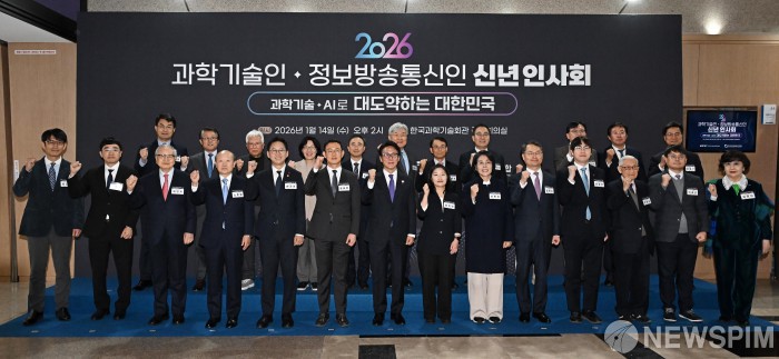 [서울=뉴스핌] 정일구 기자 = 김민석 국무총리가 14일 오후 서울 강남구 한국과학기술회관에서 열린 과학기술인·정보방송통신인 신년인사회에서 참석자들과 기념촬영을 하고 있다. 2026.01.14 mironj19@newspim.com