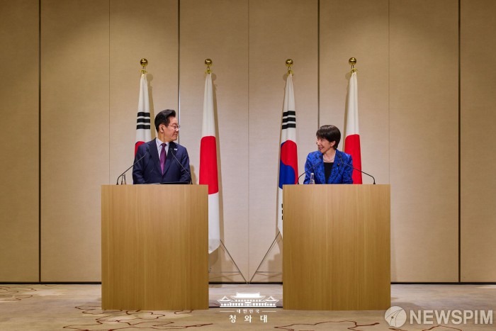 [서울=뉴스핌] 이재명 대통령이 지난 13일 일본 나라현에서 다카이치 총리와 정상회담을 마치고 공동언론발표를 하고 있다. [사진=청와대] 2026.01.14 photo@newspim.com