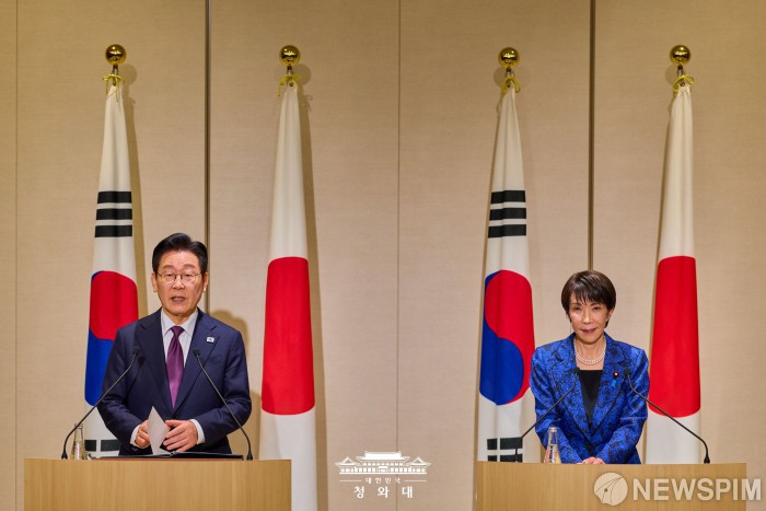 [서울=뉴스핌] 이재명 대통령이 지난 13일 일본 나라현에서 다카이치 총리와 정상회담을 마치고 공동언론발표를 하고 있다. [사진=청와대] 2026.01.14 photo@newspim.com