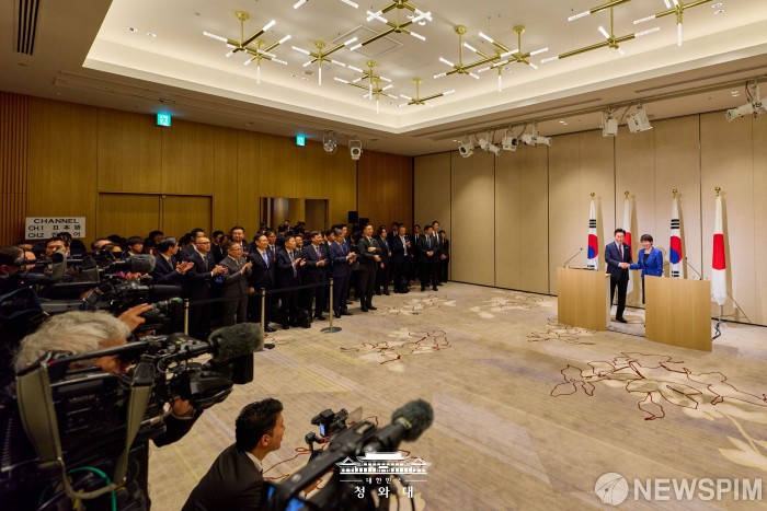[서울=뉴스핌] 이재명 대통령이 지난 13일 일본 나라현에서 다카이치 총리와 정상회담을 마치고 공동언론발표를 하고 있다. [사진=청와대] 2026.01.14 photo@newspim.com