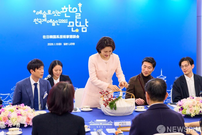 [서울=뉴스핌] 김혜경 여사가 지난 13일 일본 나라컨벤션센터에서 열린 재일 한국계 예술인 간담회에서 다과를 꺼내고 있다. [사진=청와대] 2026.01.14 photo@newspim.com