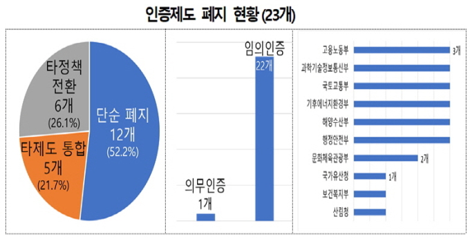 폐지된 인증에는 ▲건강친화기업 ▲스마트도시 ▲우수 철도서비스 ▲수산식품 명인 등 23개가 대거 포함됐다(아래 표 참고).