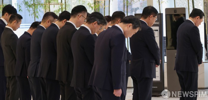 [서울=뉴스핌] 류기찬 기자 = 신동빈 롯데그룹 회장과 임직원들이 15일 오전 서울 송파구 롯데월드타워에서 열린 ‘롯데 창업주 고(故) 신격호 명예회장 6주기 추모식에서 묵념을 하고 있다. 2026.01.15 ryuchan0925@newspim.com